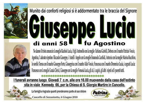 Ne danno il triste annuncio: la moglie Rachele Lucia, i figli Antonello con la moglie Fabiana Gubelli, Debora con il marito Patrizio Vescio, Agostina, l' adorato nipotino Riccardo Giuseppe, i fratelli Angelo con la moglie Emanuela Carchidi, Antonio con la moglie Marina Bucchino, le sorelle Teresa con il marito Giuseppe Forte, Giuseppina con il marito Aldo Vescio, Francesca con il marito Domenico Lucia, i cognati Lucia: Francesco con la moglie Grazia Clerici, Giuseppe con la moglie Venusia Lucia, gli zii, i cugini, gli altri nipoti ed i parenti tutti.