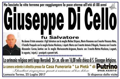 La camera ardente è allestita presso la Casa Funeraria '' La Pietà '' di Putrino