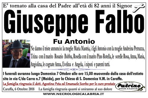 Caraffa, 6 Ottobre 2018 La famiglia ringrazia quanti si uniranno al suo dolore