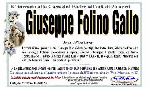 Lo comunicano a parenti e amici, la moglie Maria Mercurio, i figli: Don Pietro, Luca, Salvatore e Francesco con la moglie Federica Ciccomascolo, i nipotini: Ginevra e Giuseppe, le sorelle: Teresa ved. Sauro, Tommasina con il marito Domenico Pallone, Lina e Dina ved. Chieffe, la cognata Rosina Mercurio con il marito Giovanni Guzzo, altri nipoti ed i parenti tutti.