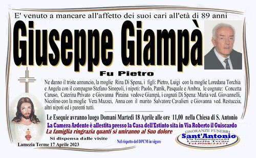 Ne danno il triste annuncio la maglie Rina Di Spena, i figli: Pietro, Luigi con la moglie Loredana Torchia e Angela con il compagno Stefano Sinopoli, i nipoti: Paolo, Patrik, Pasquale e Ambra, le cognate: Concetta Caruso, Caterina Privato e Giovanna Piraina vedove Giampà, i cognati Di Spena: Maria vedova Giovannelli, Nicolino con la moglie Vera Mazzei, Anna con il marito Salvatore Cavalieri e Giovanna vedova Restuccia, altri nipoti e parenti tutti.