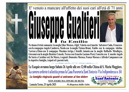 Ne danno il triste annuncio: la moglie Elisa Moraca, i figli: Valeria con il marito Salvatore Cuda, Francesco con la compagna Angela Candurro, Nicola con la moglie Tiziana Bruni, Emilio con la compagna Adelina Varrese e Elena con il compagno Massimo Arrigo, i fratelli: Antonio con la moglie Raffaella Mirallegro, Giovanni con la moglie Beatrice Console, Teresa con il marito Luciano Persi, Concetta con il marito Angelo De Sarro e Carolina ved. De Marco, i cognati: Domenico Moraca, Franco Moraca e Alfredo Campanaro con le rispettive famiglie, i nipoti ed i parenti tutti.