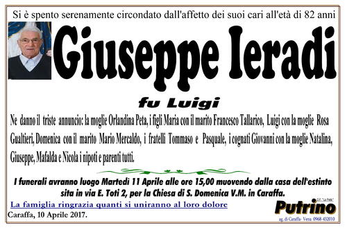 Ne danno il triste annuncio: la moglie Orlandina Peta, i figli Maria con il marito Francesco Tallarico, Luigi con la moglie Rosa Gualtieri, Domenica con il marito Mario Mercaldo, i fratelli Tommaso e Pasquale, i cognati Giovanni con la moglie Natalina, Giuseppe, Mafalda e Nicola i nipoti e parenti tutti.