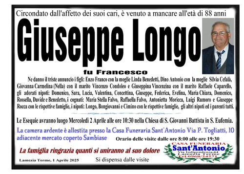 Ne danno il triste annuncio i figli: Enzo Franco con la moglie Linda Benedetti, Dino Antonio con la moglie Silvia Cefalà,Giovanna Carmelina (Nella) con il marito Vincenzo Condoleo e Giuseppina Vincenzina con il marito Raffaele Caparello, gli adorati nipoti: Domenico, Sara, Lucia, Valentina, Concettina, Giuseppe, Federica, Evelina, Maria Chiara, Domenico, Rossella, Davide e Benedetto, i cognati: Maria Stella Falvo, Raffaella Falvo, Antonietta Moricca, Luigi Rumoro e Giuseppe Rocca con le rispettive famiglie, i nipoti: Longo, Bongiovanni e Cimino con le rispettive famiglie, gli altri nipoti e parenti tutti.