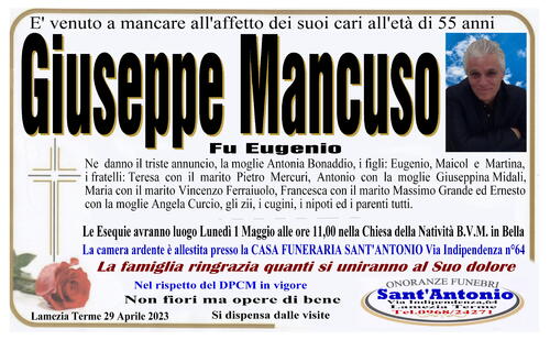 Ne danno il triste annuncio, la moglie Antonia Bonaddio, i figli: Eugenio, Maicol e Martina, i fratelli: Teresa con il marito Pietro Mercuri, Antonio con la moglie Giuseppina Midali, Maria con il marito Vincenzo Ferraiuolo, Francesca con il marito Massimo Grande ed Ernesto con la moglie Angela Curcio, gli zii, i cugini, i nipoti ed i parenti tutti.