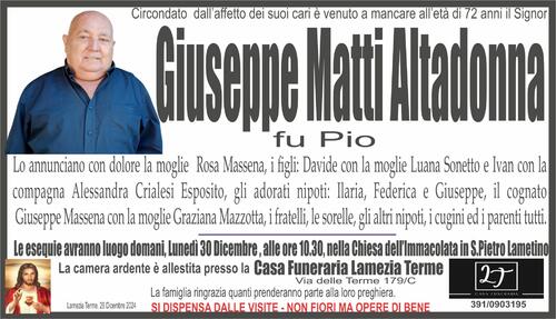 Lo annunciano con dolore la moglie Rosa Massena, i figli: Davide con la moglie Luana Sonetto e Ivan con la