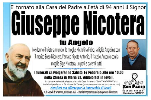 I funerali si svolgeranno Sabato 14 Febbraio alle ore 10.00