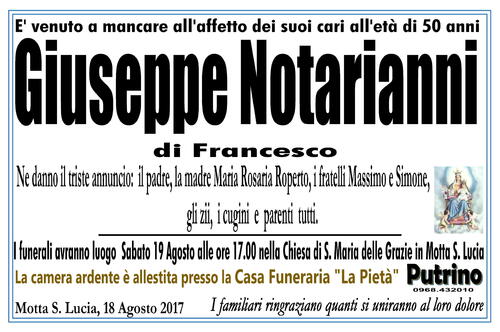 I funerali avranno luogo Sabato 19 Agosto alle ore 17.00 nella Chiesa di S. Maria delle Grazie in Motta S. Lucia