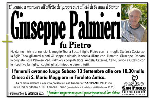 I funerali avranno luogo Sabato 13 Settembre alle ore 10.30 nella