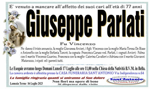 Ne danno il triste annuncio, la moglie Giovanna Arcieri, i figli: Vincenzo con la moglie Maria Teresa De Biase e Antonello con la moglie Stefania Tancrè, la cognata Francesca Caruso ved. Parlati, i cognati Arcieri: Palma con il marito Vincenzo Guarino, Francesco con la moglie Caterina Cavalieri e Adriana con il marito Giovanni Matarazzo, i nipoti ed i parenti tutti.