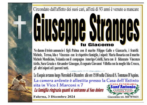 Ne danno il triste annuncio i figli: Palma con il Marito Filippo Gallo e Giancarlo, i fratelli: Michele, Teresa, Ida e Vincenzo con le rispettive famiglie, i nipoti: Maria Rosaria con il marito Michele Mendicino, Yolanda con il compagno Amerigo Colelli, Sara con il fidanzato Vincenzo Aiello, Sara Grazia e Alexsander Giuseppe, il cognato Giovanni Villella con la moglie Ida Crocco, gli altri nipoti ed i parenti tutti.