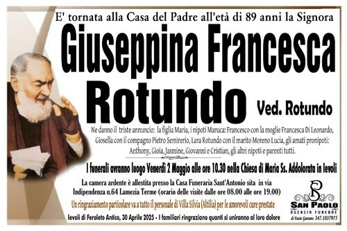 I funerali avranno luogo Venerdì 2 Maggio alle ore 10.30 nella Chiesa di Maria Ss. Addolorata in Ievoli
