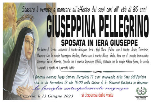 i funerali avranno luogo domani Mercoledi 14 c.m. muovendo dalla Casa dell' Estinta sita in Via Fiorentino 13 alle 16:00 nella chiesa di S. Giovanni Battista in Gizzeria.