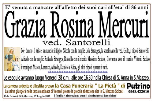 Le esequie avranno luogo Venerdì 28 c.m. alle ore 16,30 nella Chiesa di S. Anna in S.Mazzeo.