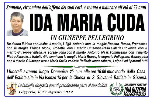 I funerali avranno luogo Domenica 25 c.m alle ore 16:00 muovendo dalla Casa