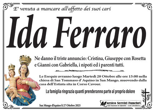 Le Esequie avranno luogo Martedì 28 Ottobre alle ore 15:00 nella chiesa di San Tommaso d'Aquino in San Mango, muovendo dalla casa dell'Estinta sita in Corso Cavour.