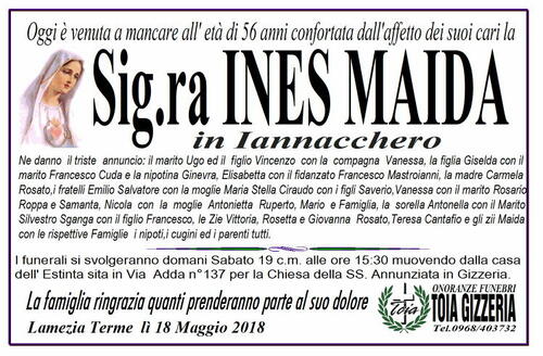 I funerali si svolgeranno domani Sabato 19 c.m. alle ore 15:30 muovendo dalla casa