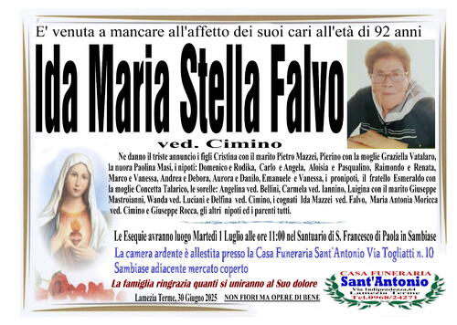 Ne danno il triste annuncio: i figli Cristina con il marito Pietro Mazzei, Pierino con la moglie Graziella Vatalaro, la nuora Paolina Masi, i nipoti: Domenico e Rodika, Carlo e Angela, Aloisia e Pasqualino, Raimondo e Renata, Marco e Vanessa, Andrea e Debora, Aurora e Danilo, Emanuele e Vanessa, i pronipoti, il fratello Esmeraldo con la moglie Concetta Talarico, le sorelle: Angelina ved. Bellini, Carmela ved. Iannino, Luigina con il marito Giuseppe Mastroianni, Wanda ved. Luciani e Delfina ved. Cimino, i cognati: Ida Mazzei ved. Falvo, Maria Antonia Moricca ved. Cimino e Giuseppe Rocca, glia altri nipoti e parenti tutti.