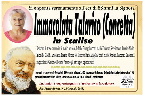 I funerali avranno luogo Mercoledì 24 Gennaio alle ore 14,00 muovendo dalla casa dell'estinta sita in via Venezia n° 51,