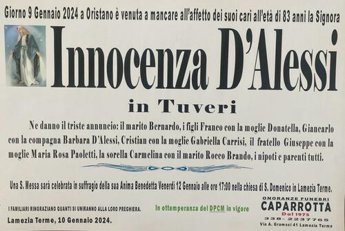Una S. messa sarà celebrata in suffragio della sua Anima Benedetta Venerdì 12 Gennaio alle ore 17:00 nella Chiesa di S. Domenico in Lamezia Terme.