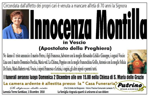 Lamezia Terme Sambiase, 1 Dicembre 2018 La famiglia ringrazia quanti si uniranno al suo dolore
