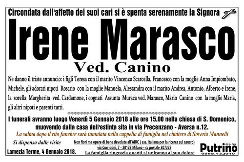 I funerali avranno luogo Venerdì 5 Gennaio 2018 alle ore 15,00 nella chiesa di S. Domenico,