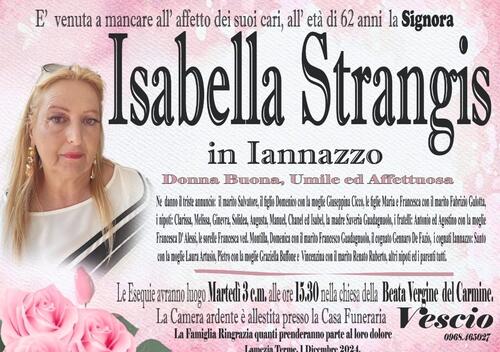 Ne danno il triste annuncio: il marito Salvatore, il figlio Domenico con la moglie Giuseppina Cicco, le figlie Maria e Francesca con il marito Fabrizio Gulotta, i nipoti: Clarissa, Melissa, Ginevra, Solidea, Augusta, Manuel, Chanel ed Isabel, la madre Saveria Guadagnuolo, i fratelli: Antonio ed Agostino con la moglie Francesca D' Alessi, le sorelle Francesca ved. Montilla, Domenica con il marito Francesco Guadagnuolo, il cognato Gennaro De Fazio, i cognati Iannazzo: Santo con la moglie Laura Artusio, Pietro con la moglie Graziella Buffone e Vincenzina con il marito Renato Ruberto, altri nipoti ed i parenti tutti.