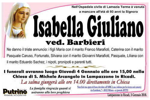 I funerali avranno luogo Giovedì 4 Gennaio alle ore 15,00 nella