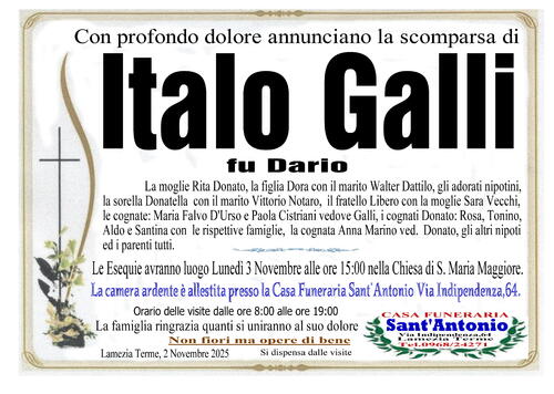 La moglie Rita Donato, la figlia Dora con il marito Walter Dattilo, gli adorati nipotini, la sorella Donatella con il marito Vittorio Notaro, il fratello Libero con la moglie Sara Vecchi, le cognate: Maria Falvo D'Urso e Paola Cristiani vedove Galli, i cognati Donato: Rosa, Tonino, Aldo e Santina con le rispettive famiglie,la cognata Anna Marino ved. Donato, gli altri nipoti ed i parenti tutti.