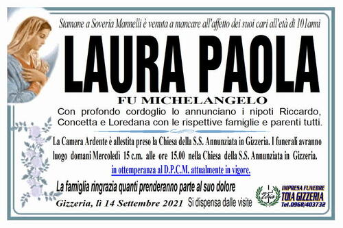 La Camera Ardente è allestita preso la Chiesa della S.S. Annunziata in Gizzeria. I funerali avranno