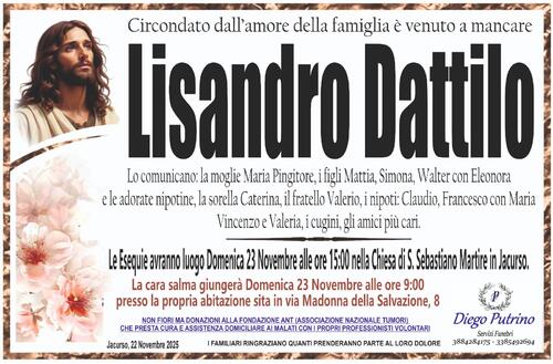 Le esequie avranno luogo Domenica 23 Novembre alle ore 15:00 nella Chiesa di S. Sebastiano Martire in Jacurso.