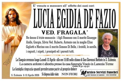 Le Esequie avranno luogo Lunedi 13 Aprile alle ore 15:00 nella chiesa di San Giovanni Battista in S. Eufemia.