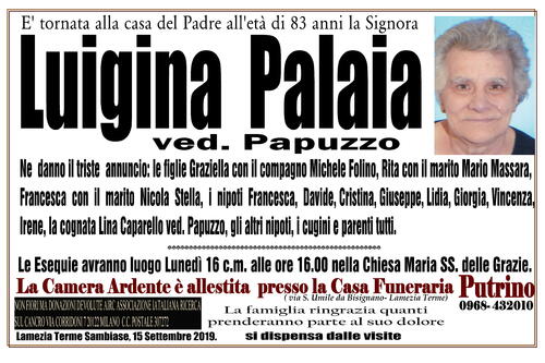 Le Esequie avranno luogo Lunedì 16 c.m. alle ore 16.00 nella Chiesa Maria SS. delle Grazie.
