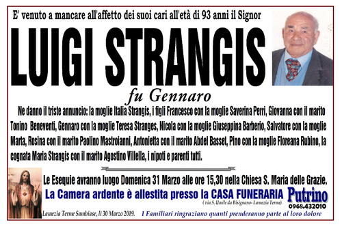 Le Esequie avranno luogo Domenica 31 Marzo alle ore 15,30 nella Chiesa S. Maria delle Grazie.