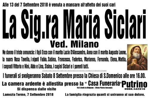 I funerali si svolgeranno Sabato 8 Settembre presso la Chiesa di S.Domenico alle ore 16.00.