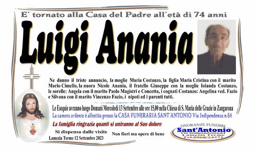 Ne danno il triste annuncio, la moglie Maria Costanzo, la figlia Maria Cristina con il marito Mario Cimello, la nuora Nicole Anania, il fratello Giuseppe con la moglie Iolanda Costanzo, le sorelle: Angela con il marito Paolo Magistri e Concetta, i cognati Costanzo: Angelina ved. Fazio e Silvana con il marito Vincenzo Fazio, i nipoti ed i parenti tutti.