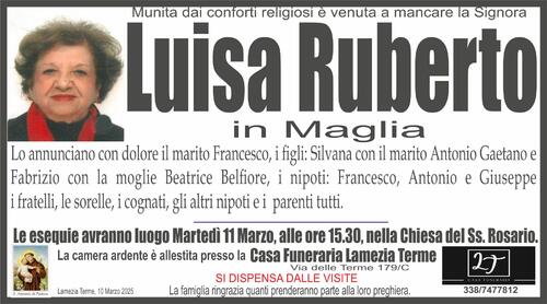 Lo annunciano con dolore il marito Francesco, i figli: Silvana con il marito Antonio Gaetano e