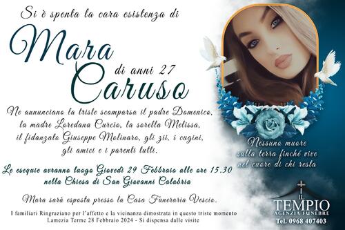 Mara sarà esposta presso la Casa Funeraria Vescio.
