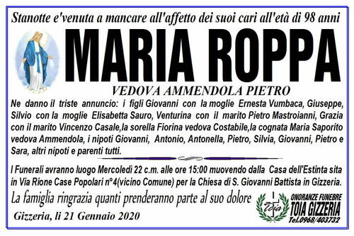 I Funerali avranno luogo Mercoledì 22 c.m. alle ore 15:00 muovendo dalla Casa dell'Estinta sita