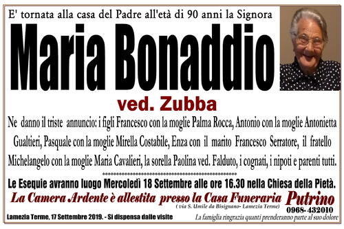 Le Esequie avranno luogo Mercoledì 18 Settembre alle ore 16.30 nella Chiesa della Pietà .