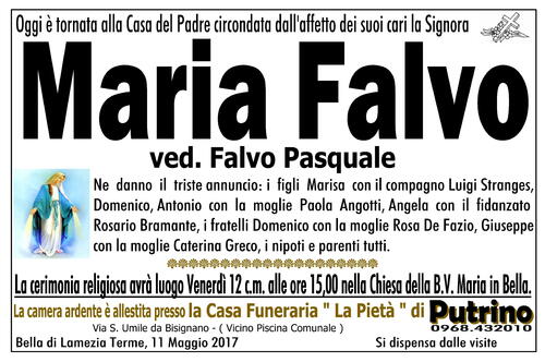 La cerimonia religiosa avrà luogo Venerdì 12 c.m. alle ore 15,00 nella Chiesa della B.V. Maria in Bella.