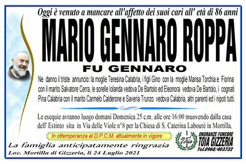 Le esequie avranno luogo domani Domenica 25 c.m. alle ore 16:00 muovendo dalla casa