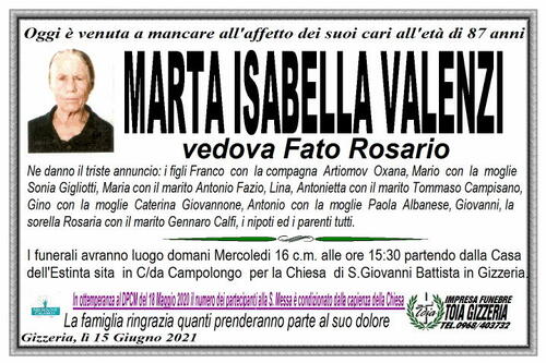I funerali avranno luogo domani Mercoledi 16 c.m. alle ore 15:30 partendo dalla Casa