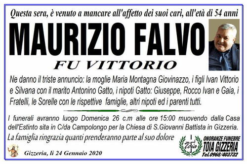 I funerali avranno luogo Domenica 26 c.m alle ore 15:00 muovendo dalla Casa dell'Estinto sita in C/da Campolongo per la Chiesa di S.Giovanni Battista in Gizzeria.