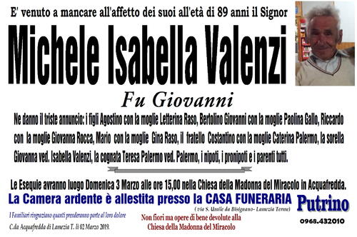 Le Esequie avranno luogo Domenica 3 Marzo alle ore 15,00 nella Chiesa della Madonna del Miracolo in Acquafredda.