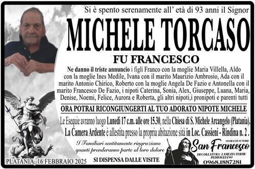 Ne danno il triste annuncio i figli Franco con la moglie Maria Villella, Aldo con la moglie Ines Medile, Ivana con il marito Maurizio Ambrosio, Ada con il marito Antonio Chirico, Roberto con la moglie Angela De Fazio e Antonella con il marito Francesco De Fazio, i nipoti Caterina, Sonia, Alex, Giuseppe, Luana, Maria, Denise, Noemi, Felice, Aurora e Roberta, gli altri nipoti,i pronipoti e parenti tutti