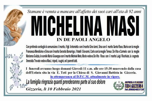 Con profondo cordoglio lo annunciano: il marito, i figli Antonietta con il marito Gino Ianni, Sina con il marito Santo Raso, Mario con la moglie