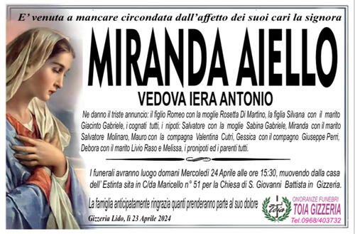 I funerali avranno luogo domani Mercoledì 24 Aprile alle ore 15:30, muovendo dalla casa