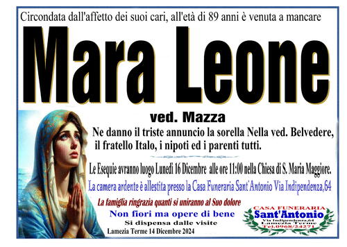 Ne danno il triste annuncio la sorella Nella ved. Belvedere, il fratello Italo, i nipoti ed i parenti tutti.