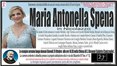 Ne danno il triste annuncio il marito Michele, i figli Martina con il marito Michele Renda, Manuel con la fidanzata Sonia,